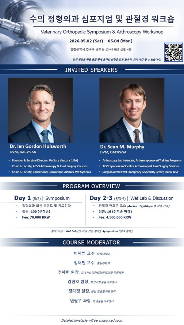 특히 이번 심포지엄와 워크숍에는 수의정형외과 및 관절경 분야에서 세계적으로 저명한 Dr. Ian Gordon Holsworth과 Dr. Sean M. Murphy이 내한해 이론 강의와 실습을 진행할 예정이어서 벌써부터 많은 기대를 모으고 있다.