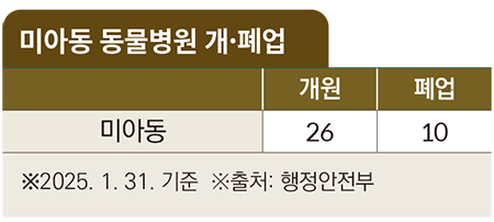 이는 미아동 일대가 대단지 아파트와 기존 주거지역이 혼재된 전형적인 생활형 주거 상권으로, 반려동물 양육 가구가 안정적으로 형성돼 있음을 보여준다. 단기적인 유행이나 외부 변수에 크게 흔들리기보다는 일상적인 진료 수요가 지속적으로 발생하는 구조라는 점에서 기본적인 상권 체력이 있는 것으로 분석된다.